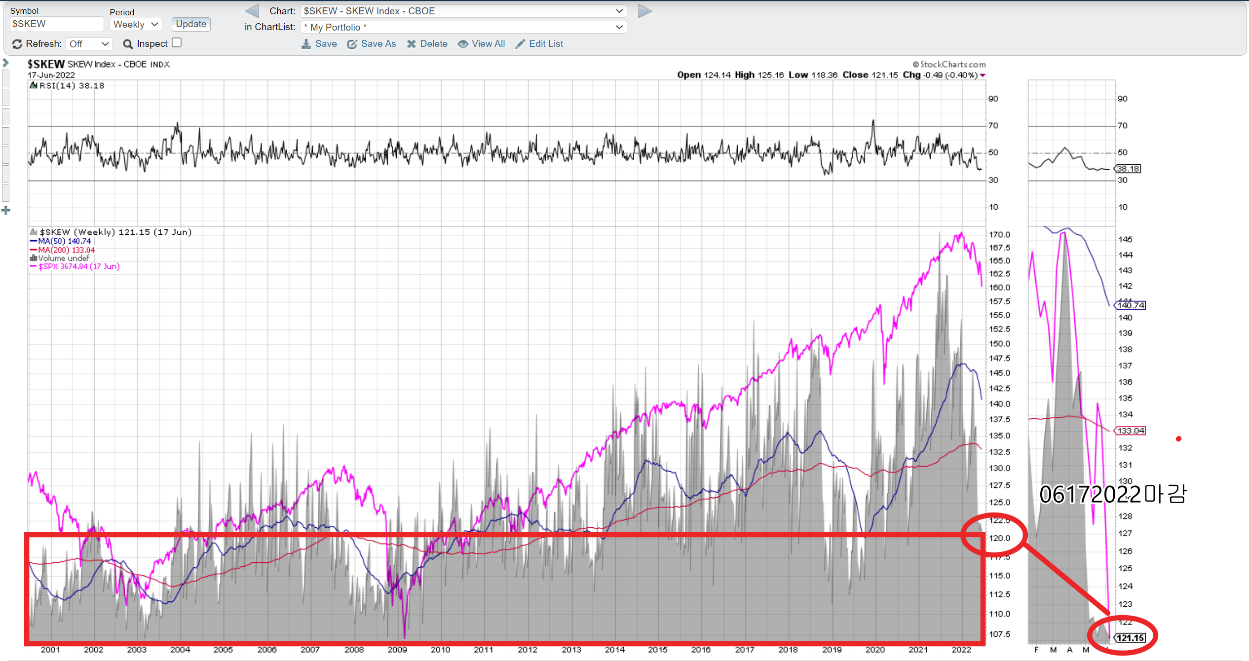 skew index의 기준은 100이고 그 값이 치우쳐서 100보다 높다면 급락을 할수 있는 수가 커진다고 보면 됩니다.