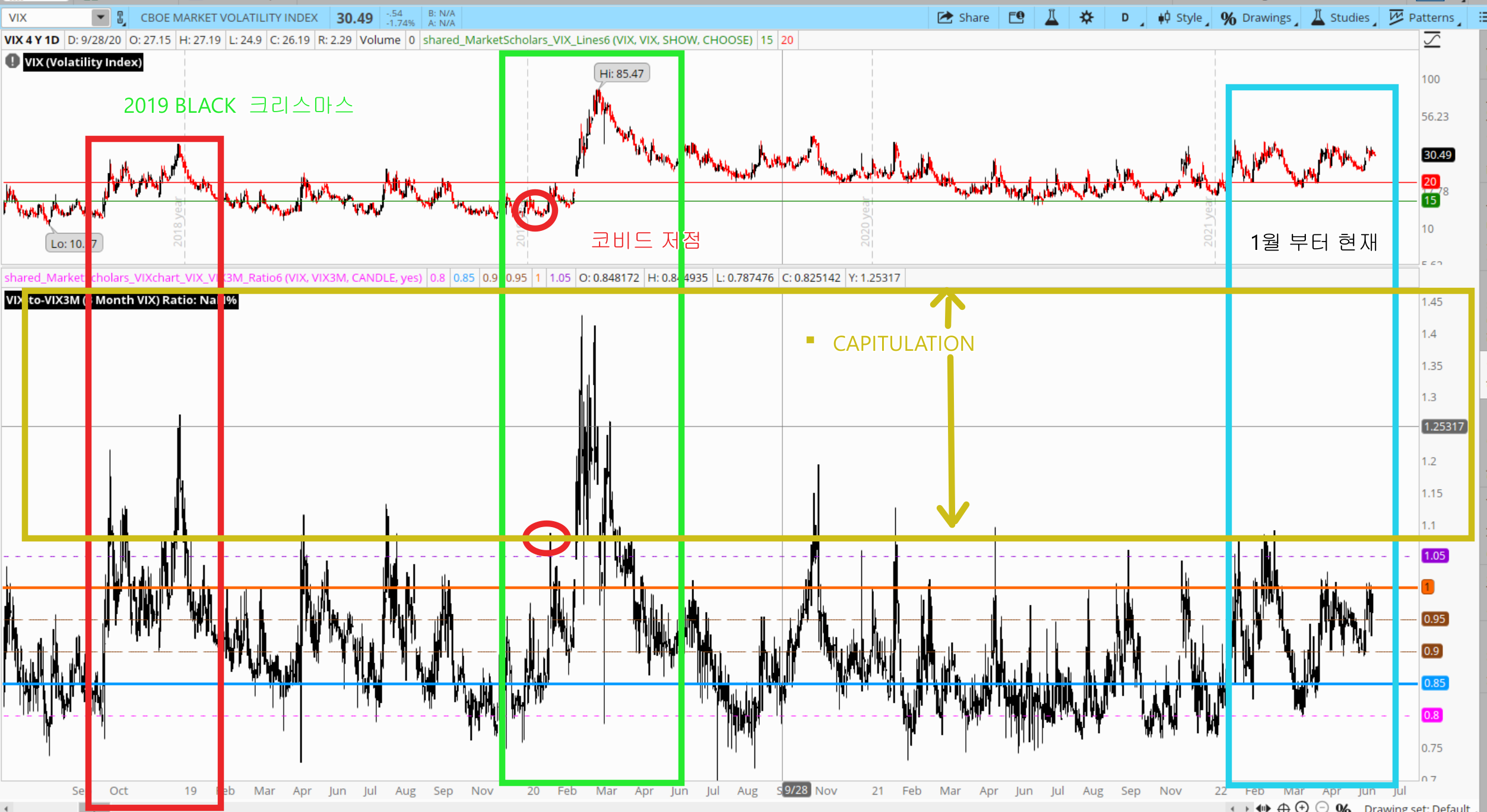 (VIX 3M은 세달후 마감의 VIX- VIX 3M 의 변동이 안정되어야 장이 3달후에 변동이 잦아 든다고 읽어요. VIX 3M 은 1.25 정도의 상승이 있어야 CAPITULATION 이 있었다고 봅니다.)