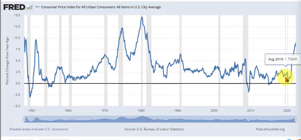 2019년에는 FED FUND RATE이 POSITIVE 라 할수 있었지만 지금은 위 챠트에서 보듯 마이너스가 작렬중..CPI 2019는 2% 보다 낮았기 때문에 할수 있었죠.. 아래 챠트
