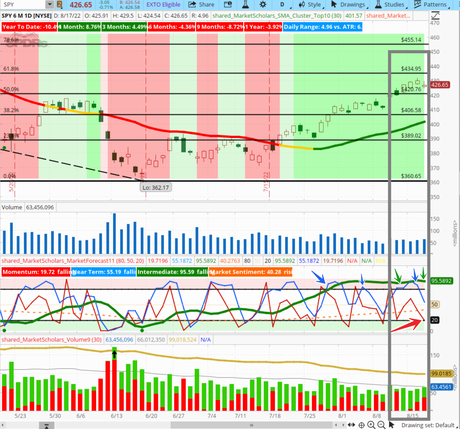 파란색 화살표는 nearterm의 파란 라인- 어제 파동이 mature 해서 눌림이 있을것으로 봤고 오늘 하락을 하면서 빨간색 모멘텀 라인이 20 살짝 아래.. 리버살 존에서 끝남. 하지만 트렌드가 바뀐건 아님.. 초록색 intermediate line 이 여전히 bulllish zone에 있어서 어디 까지 반등할지는 모르나 shorttem bounce가 있을거고 그 바운가 강하지 못하고 다시 불리쉬 존에 들어가지 못하고 20아래로 하향을 하면서 nearterm을 20 아랫쪽으로 끌어내린다면 추가 하락이 있을수 있습니다.