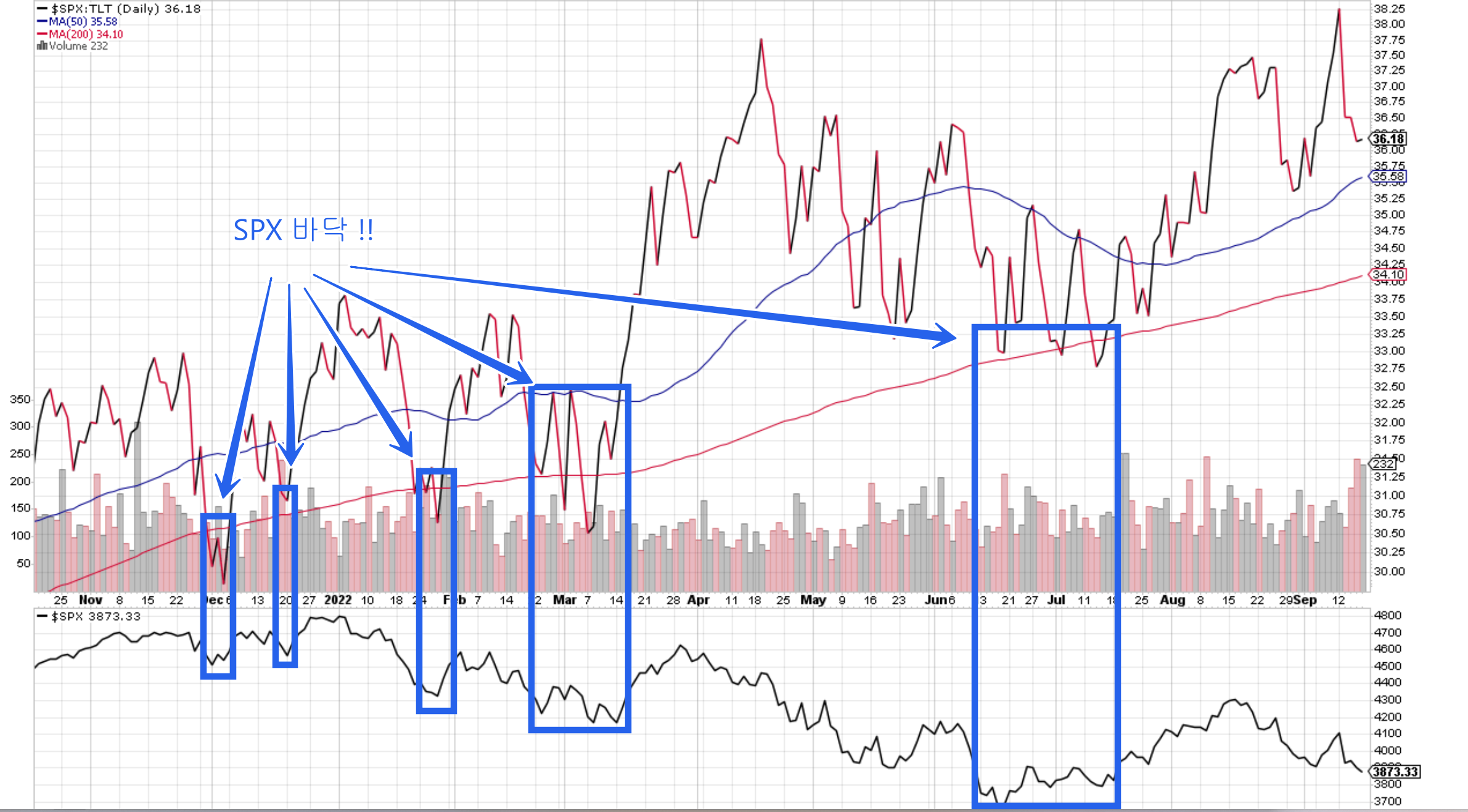 챠트의 윗부분은 TLT 랑 SPX 비벼논 챠트고 아래는 SPX